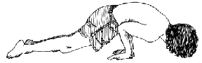18. Single Leg Reverse. Stretch out the front of that same leg. Raise head high and emphasize the arch in the back. I usually support myself on my fists - not open palm on floor as shown. Put the foot of the bent leg more in front of you than shown - so the heel is under the thigh of the extended leg and you can collapse down on the bent leg, putting your forehead on the floor as the second part of the pose (not shown). Then, repeat 17 and 18 on the other side. |